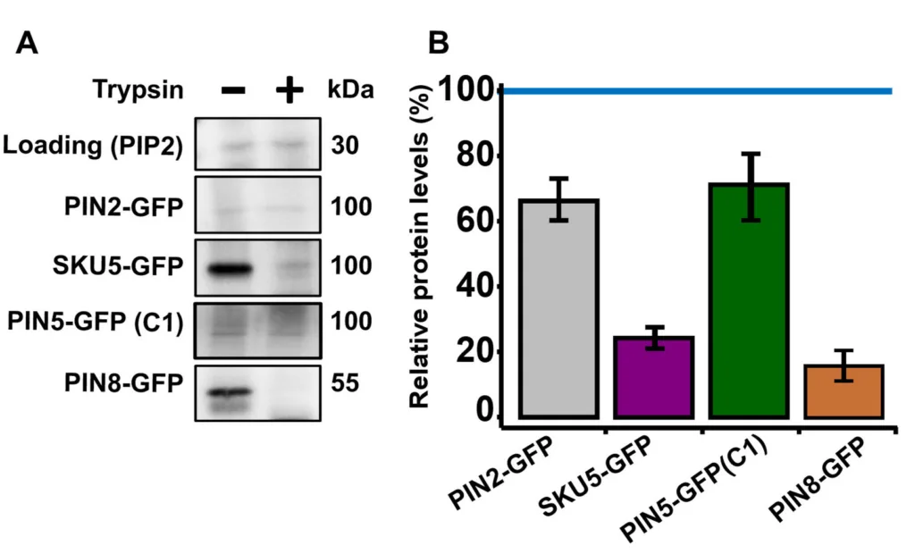 I do love the cell biology approaches also those utilising digitonin but I am happy that we were able to benefit from the biochemistry expertise of Veronika Bilanovicova and supplement (Fig. S4) the microscopy-based techniques by a western-visualised trypsin digestion of apoplast-facing protein parts, including the hydrophilic loop of the ectopically PM localised PIN8.